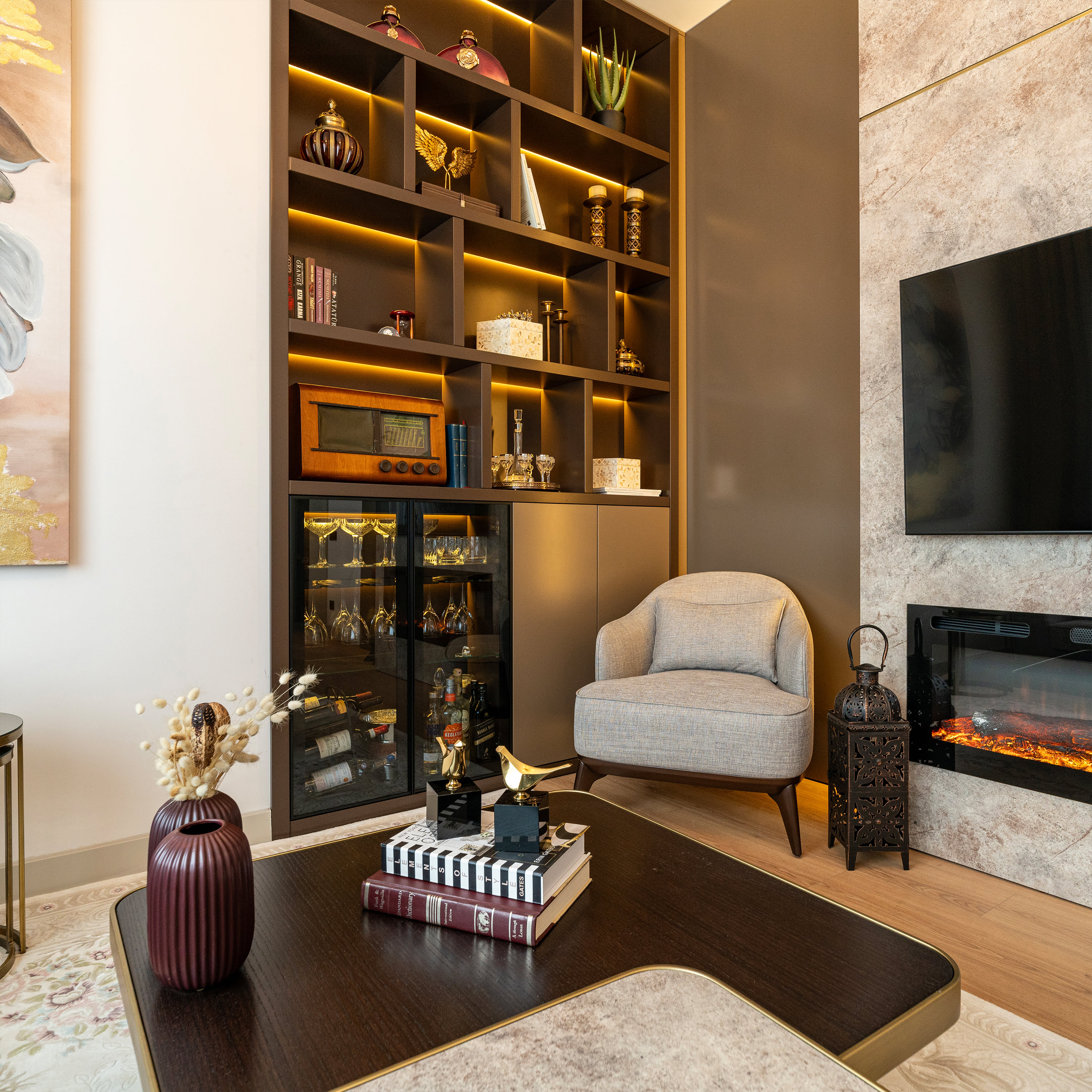 TV ünitesi ve kitaplık tasarımı duvar mimarisi ile entegre düşünülerek mekâna derinlik kazandırıldı. Yemek odası ile salon arasında akıcı bir geçiş sağlanarak modern ve dengeli bir kompozisyon oluşturuldu.
